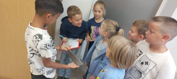 Gemeinsam mit der 4. Klasse erkundeten die Kinder der 1. Klasse das Schulhaus und entdeckten den Turnsaal, den Werkraum, die Bibliothek und andere spannende Räume.