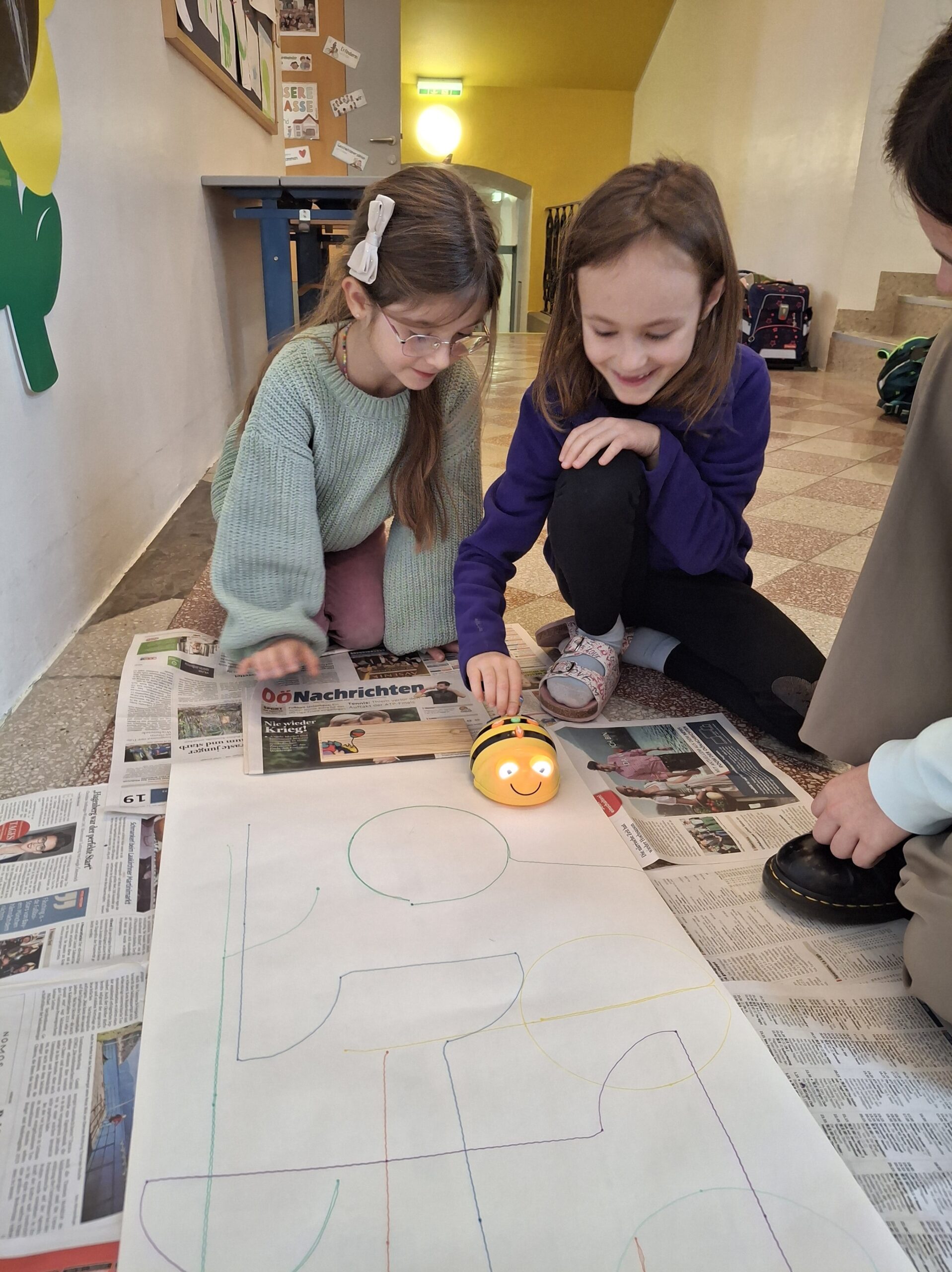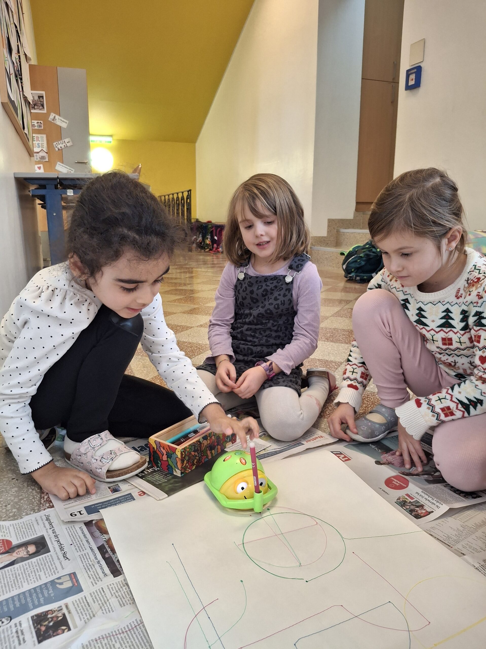 Anfang Dezember machten die Kinder der 1. Klasse ihre ersten Erfahrungen mit den Bee-Bots. Sie programmierten Bienen und lösten damit ein Buchstabenmemory. Auch ein lustiges Bild malten die Kinder mit Hilfe der Bienen.